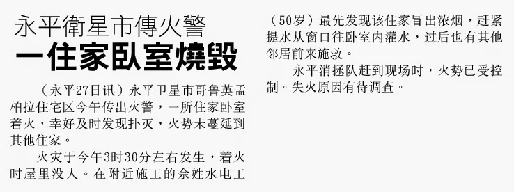 永平卫星市傅火警 一住家卧室烧毁 获取链接 Facebook X Pinterest 电子邮件 其他应用 - 一月 28, 2015 星洲日报2015.01.28 永平卫星市傅火警 一住家卧室烧毁 (永平27日汛)永平卫星市哥鲁英孟柏拉住宅区今午传出火警,一所住家卧室着火,幸好及时发现扑灭,火势未蔓延到其他住家。 火灾于今午3时30分左引发生,着火时屋里没人。在附近施工的佘姓水电工(50岁)最先发现该住家冒出浓烟,赶紧提水从窗门往卧室内灌水,过后也有其他邻居前来施救。 永平消拯队赶到现场时,火势已受控制。失火原因有待调查。 获取链接 Facebook X Pinterest 电子邮件 其他应用