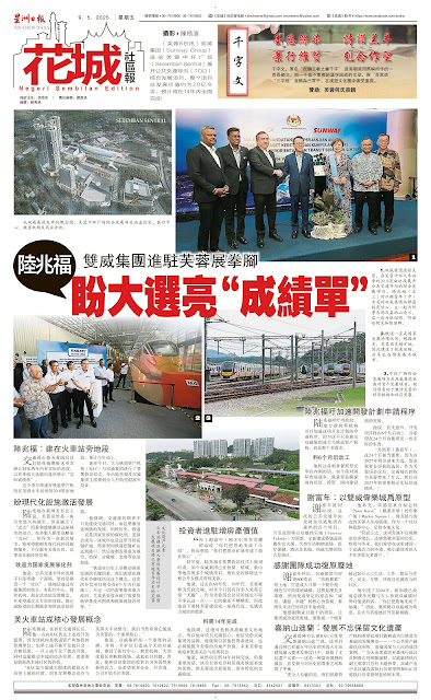 双威集团进驻芙蓉中环广场 打造20亿令吉公共交通导向综合发展项目 双威集团(Sunway Group)将在芙蓉中环广场(Seremban Sentral)展开一个总发展价值约20亿令吉的公共交通导向(TOD)综合发展项目。该项目预计在14年内全面完成。森州交通部长兼芙蓉国会议员陆兆福期盼此项目在两年内有实际进展,以便在来临大选能展示成绩单。项目将建在马来西亚铁道资产机构(RAC)位于芙蓉火车站旁的20.8英亩地段,预计今年动工。根据双威集团的概念图和谢富年的致词,此项目将以双威伟乐城(Sunway Velocity)为原型,涵盖住宅、医疗中心、教育机构及商业活动等,构成完整的综合发展区。交通部秘书长兼RAC主席嘉纳山迪兰表示,项目计划将已有逾百年历史的芙蓉火车站建筑融入整体设计,旨在发展与历史尊重之间取得平衡,并希望成为以铁道为基础发展的典范。陆兆福呼吁州政府及地方政府加速申请程序,认为此项目将惠及整个芙蓉市,提升本地经济发展、社区价值和房地产价值。他强调,交通部职责不只是建设交通项目,更是要激活老城镇发展,铁道在历史上一直是国家发展的催化剂。双威集团主席兼创办人丹斯里谢富年回忆了将800英亩“伤痕累累”的土地打造成马来西亚第一个整合型、绿色与可持续城镇(双威城)的过程,并表示将以双威城为典范,在其他地区开发新城镇。他提到,项目将建造一个“社区”,相信双威集团的结合发展概念,加上火车站的连接,能达成长期愿景和所追求的价值。预计开发项目将在6个月后动工,并希望在24个月内看到实际成果。项目将充分利用现有铁道系统的优势,使芙蓉成为更高效、更有特色的交通枢纽。项目中包含一个市集广场(Market Square),灵感来自标志性的“Pasar Karat”(跳蚤市场),将直接与芙蓉火车站链接,作为社区和旅游中心,弘扬本地文化。该发展旨在推动经济增长,同时致敬芙蓉的历史、特质与传承,建设一个充满活力的环境,吸引人才安家落户。